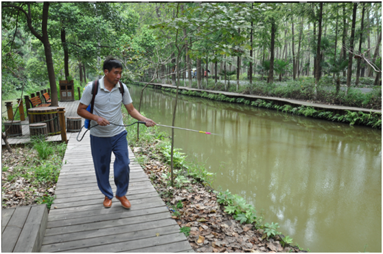 1號水域:位于焦姥路北,翠隱洞天東,長130米,均寬8米水域,面積1.62畝,1號水域相對獨(dú)立,補(bǔ)水由噴泉引地下水補(bǔ)充,水深1.5米,水體發(fā)黑,富營養(yǎng)化嚴(yán)重,透明度低;